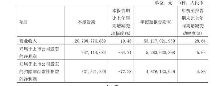 今年前三季度,广汽集团营业收入为551.17亿元,同比增长28.64%;归属于上市公司股东的净利润为52.84亿元,同比增长5.63%;归属于上市公司股东的扣除非经常性损益的净利润为45.76亿元,同比增长4.86%。