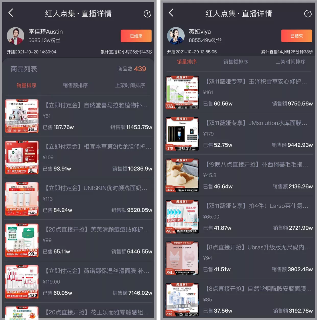 据知瓜数据显示,20号预售当天李佳琦带货商品数为439件,美妆占比将近70%。优势在于“全品类”的薇娅,当天上架499件商品,也将美妆占比提高到一半以上。美妆护肤类均是两者直播间成交额TOP 1。