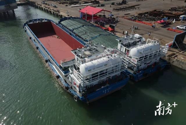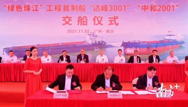 11月2日,“绿色珠江”工程LNG单一燃料动力船舶两型首制船——3000载重吨散货船“达峰3001”号、2000载重吨散货船“中和2001”号在广州南沙顺利交付。两型船由中国船舶集团旗下六〇五院设计、中船广西建造。