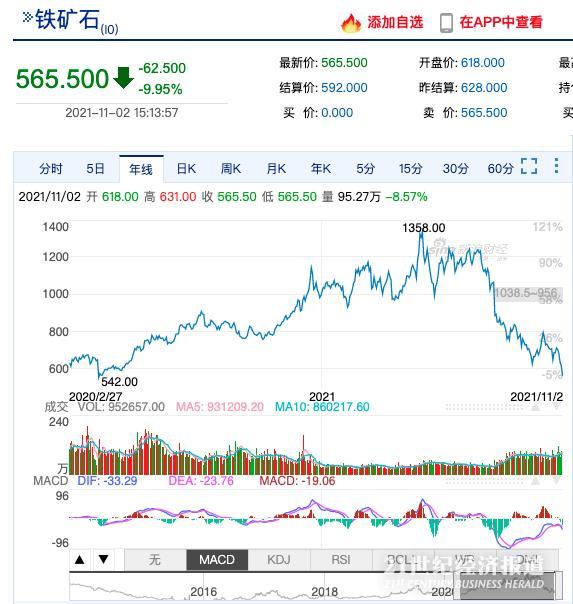 截至11月2日下午收盘,国内铁矿石期货主力合约跌停,报565.5元/吨。相较于今年5月中旬的最高点1358元/吨,铁矿石期货在5个多月内,一路下跌了近六成。
