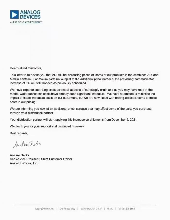 此前网络流传的ADI涨价函显示:ADI将提高ADI和旗下Maxim产品组合中的部分产品的价格,但未提及具体涨幅,涨价将从2021年12月5日起开始执行。对于不受额外价格上涨影响的Maxim产品,将继续按照之前沟通的6%的价格上涨计划执行。
