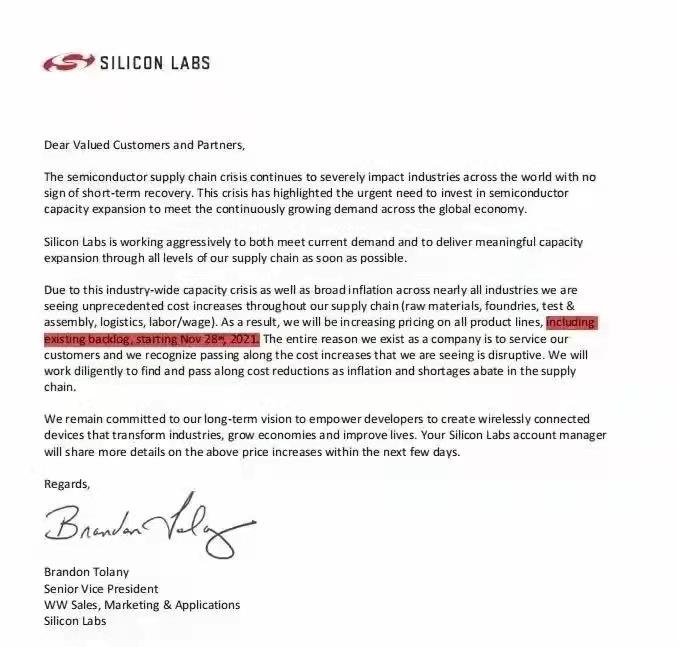 网上流传的涨价函显示:Silicon Labs将从2021年11月28日开始,提高其所有产品线的定价,包括现有积压产品订单。Silicon Labs也未在涨价函中透露具体的涨价幅度。