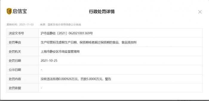 21世纪经济报道记者叶碧华 实习生冯畅 综合报道 11月3日,启信宝信息显示,因生产经营标注虚假生产日期、保质期或者超过保质期的食品、食品添加剂,上海奈雪餐饮管理有限公司南京西路分公司被上海静安区市场监督管理局罚款5万元,并没收违法所得9.26元。