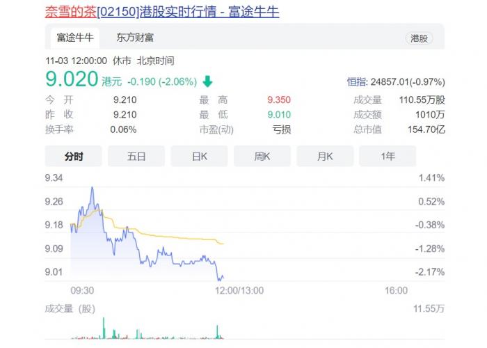 此次销售过期食品的事件被曝光后,“奈雪的茶”股价应声大跌。截至11月3日上午收盘,“奈雪的茶”股价9.02港元,为公司上市以来的历史新低,目前公司总市值154.7亿港元。