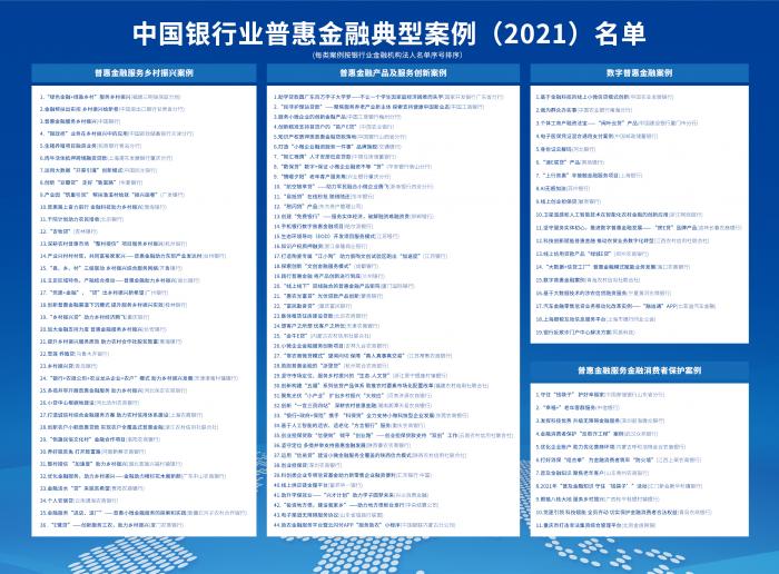据了解,中国银行业协会相关部门、21世纪金融研究院,会同多位专家和顾问,精选出110个“中国银行业普惠金融典型案例”,汇总编入《裕普惠 新金融 中国银行业普惠金融典型案例集锦(2021)》一书,并将于年内出版。