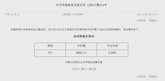 21世纪经济报道记者 叶麦穗 广州报道 临近岁末,对流动性的关心提到一年高点。据央行网站消息,为维护银行体系流动性合理充裕,2021年11月3日人民银行以利率招标方式开展了500亿元逆回购操作,中标利率2.2%,与此前持平。因当日(3日)有2000亿元逆回购到期,当日实现净回笼1500亿元。相比本月前几日,今日的逆回购量增加了400亿元,较这在月初流动性总量相对充裕的时期是较为少见的。