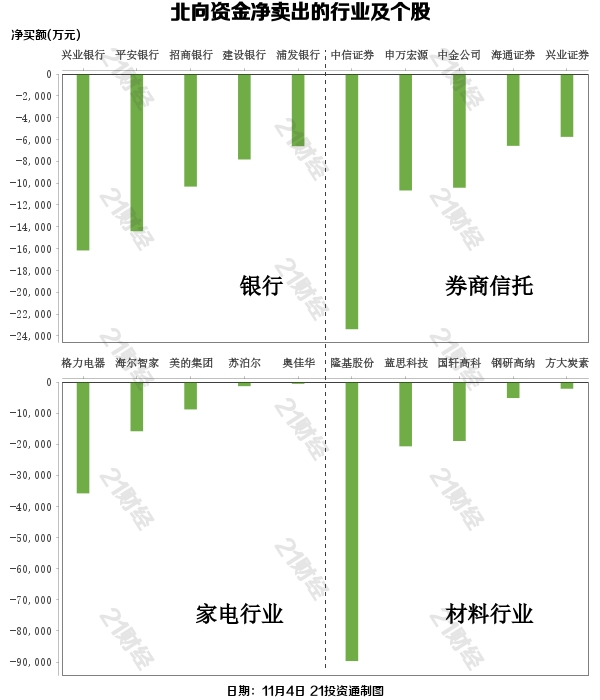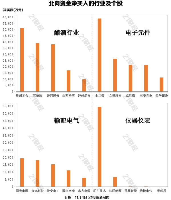 据21投资通(微信号ID:touzit21)智能监测,11月4日,北向资金净买入12.05亿元,其中沪股通净卖出0.4亿元,深股通净买入12.46亿元。