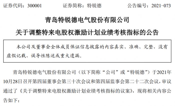 10月28日晚间,青岛特锐德电气股份有限公司(以下简称“特锐德”)发布关于调整特来电实施股权激励计划业绩考核指标的公告。