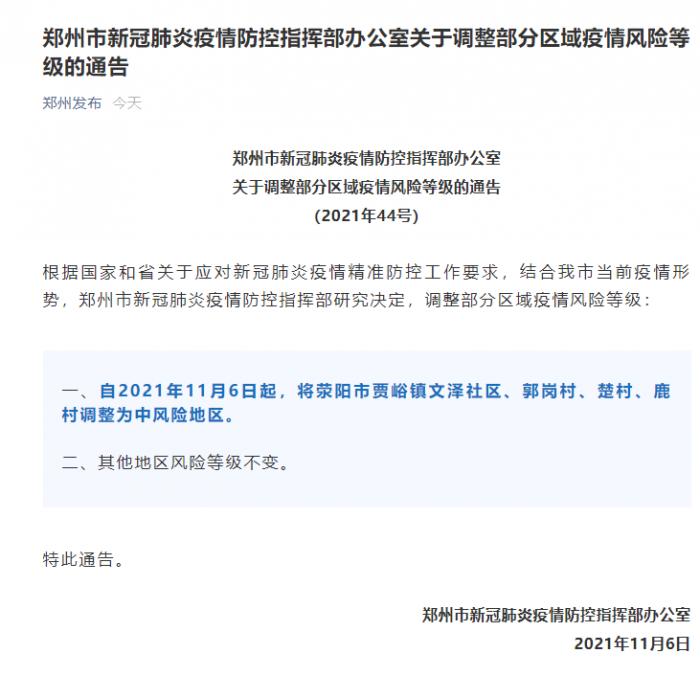 自2021年11月6日起,将荥阳市贾峪镇文泽社区、郭岗村、楚村、鹿村调整为中风险地区。