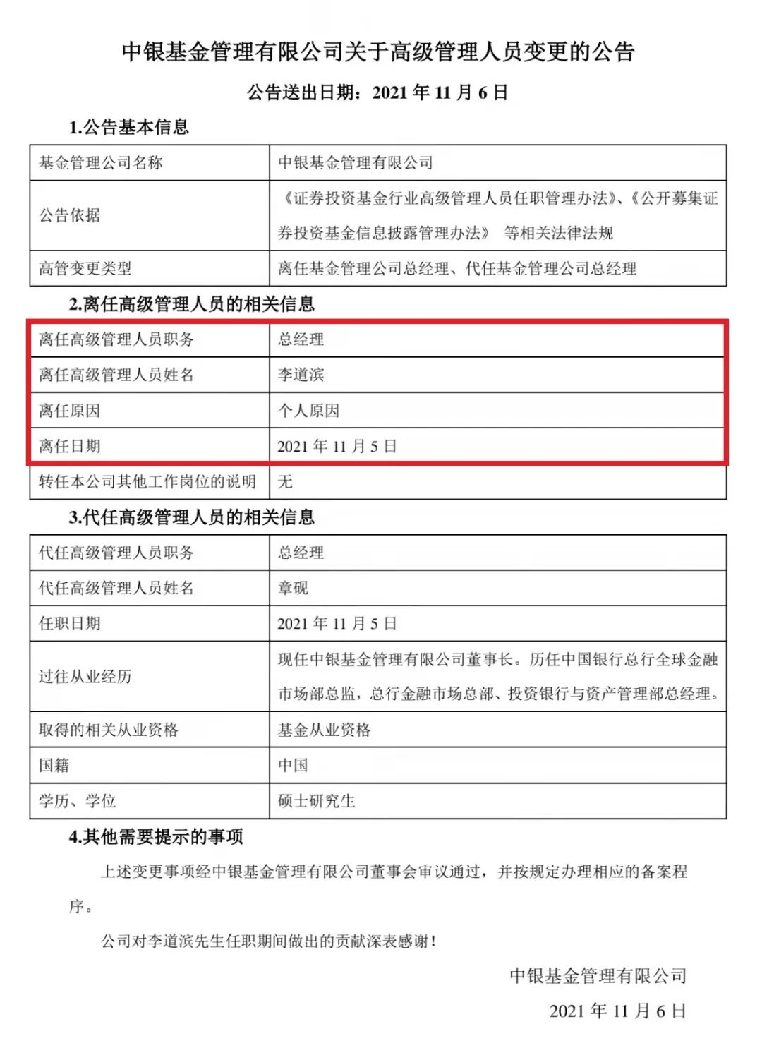 11月5日晚间,中银基金通过深交所发布高级管理人员变更的公告,公告中称,总经理李道滨因个人原因于11月5日离职,现任董事长章砚目前代任总经理一职。