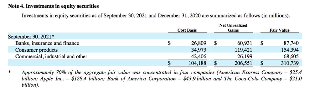 报告显示,截至9月30日,伯克希尔持股的总市值为3107.39亿美元,持仓成本为1041.88亿美元。其中,对苹果的持仓市值为1284亿美元,较二季度增加41亿美元;对美国银行的持仓市值为439亿美元,较二季度增加13亿美元;对美国运通的持仓市值为254亿美元,较二季度增加3亿美元;对可口可乐的持仓市值为210亿美元,较二季度减少 6亿美元。这四家公司的持仓市值占持仓总市值的70%。