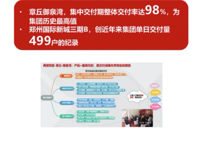 2021年是鑫苑置业项目交付规模最大的一年,1-10月,全集团实际交付12个项目、16个批次,交付套数9356套,面积105.4万平米、货值117.7亿。其中,郑州国际新城三期B项目以单日交付499户的成绩,创下公司近年来单日交付量纪录。章丘御泉湾项目集中交付期整体交付率达到98%,创下鑫苑置业历史最高值。
