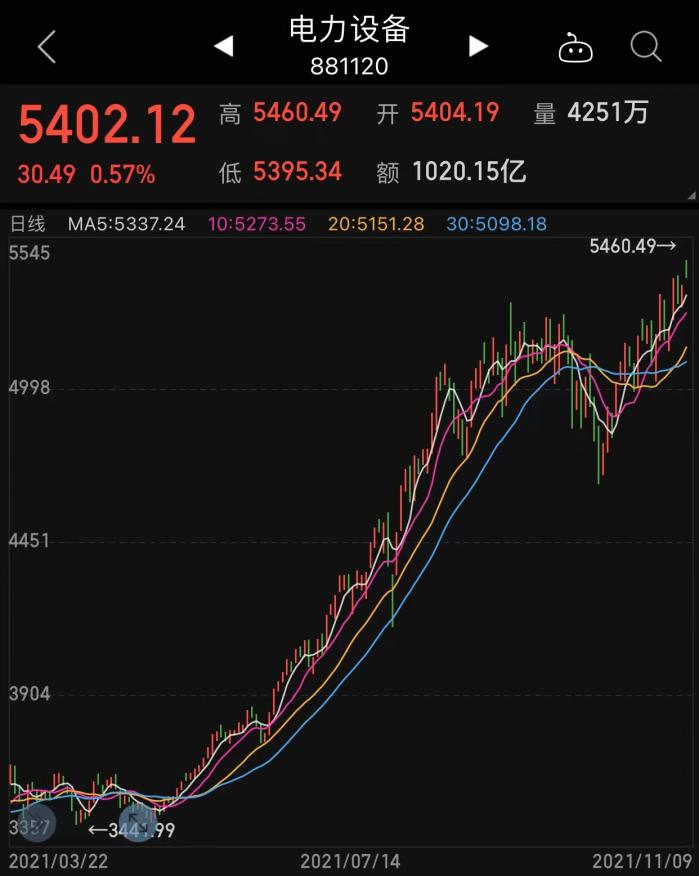 近一年多以来,电力设备板块一路上行趋势,截至11月9日午盘,电力设备上涨0.57%。