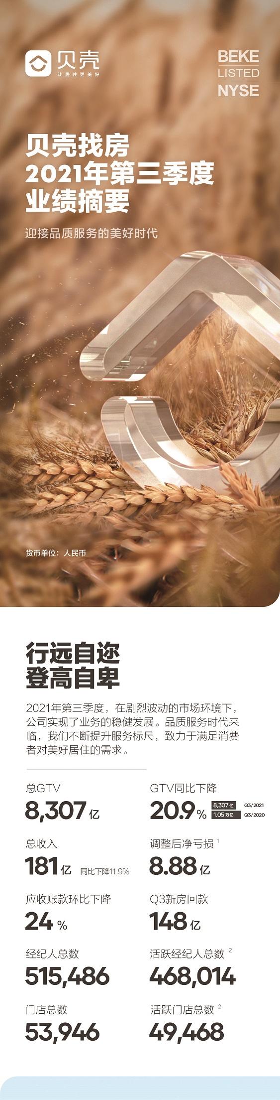 北京时间11月9日,科技驱动的新居住服务商贝壳(NYSE:BEKE)发布了2021年第三季度业绩。三季度,贝壳营业收入达181亿元(人民币,下同),同比下降11.9%,经调整后净亏损8.88亿元。三季度,贝壳成交额(GTV)达8307亿元,同比下降20.9%。