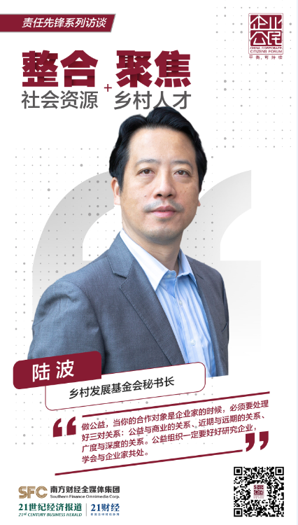 陆波博士从2007年开始专职从事公益,在与企业家合作开展公益方面历练丰富,颇有建树。乡村发展基金会以人才培养作为参与乡村振兴的切入点,为此设计了多个新颖的公益项目,正在努力实施推进。我们日前专访陆波博士,与他就乡村振兴人才培养、社会组织在乡村振兴中的角色、公益人与企业家合作等问题进行了深入交流。