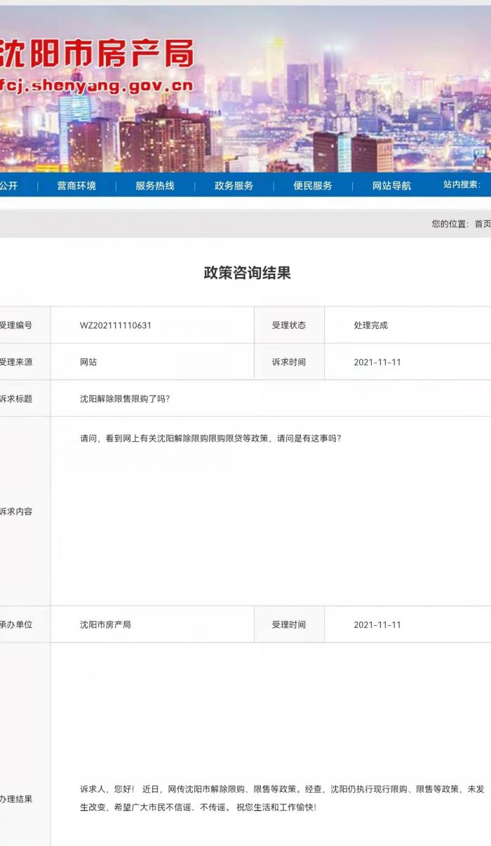 11月11日消息,有市民在沈阳市房产局网站提问称“看到网上有关沈阳解除限购限购限贷等政策,请问是有这事吗?”。