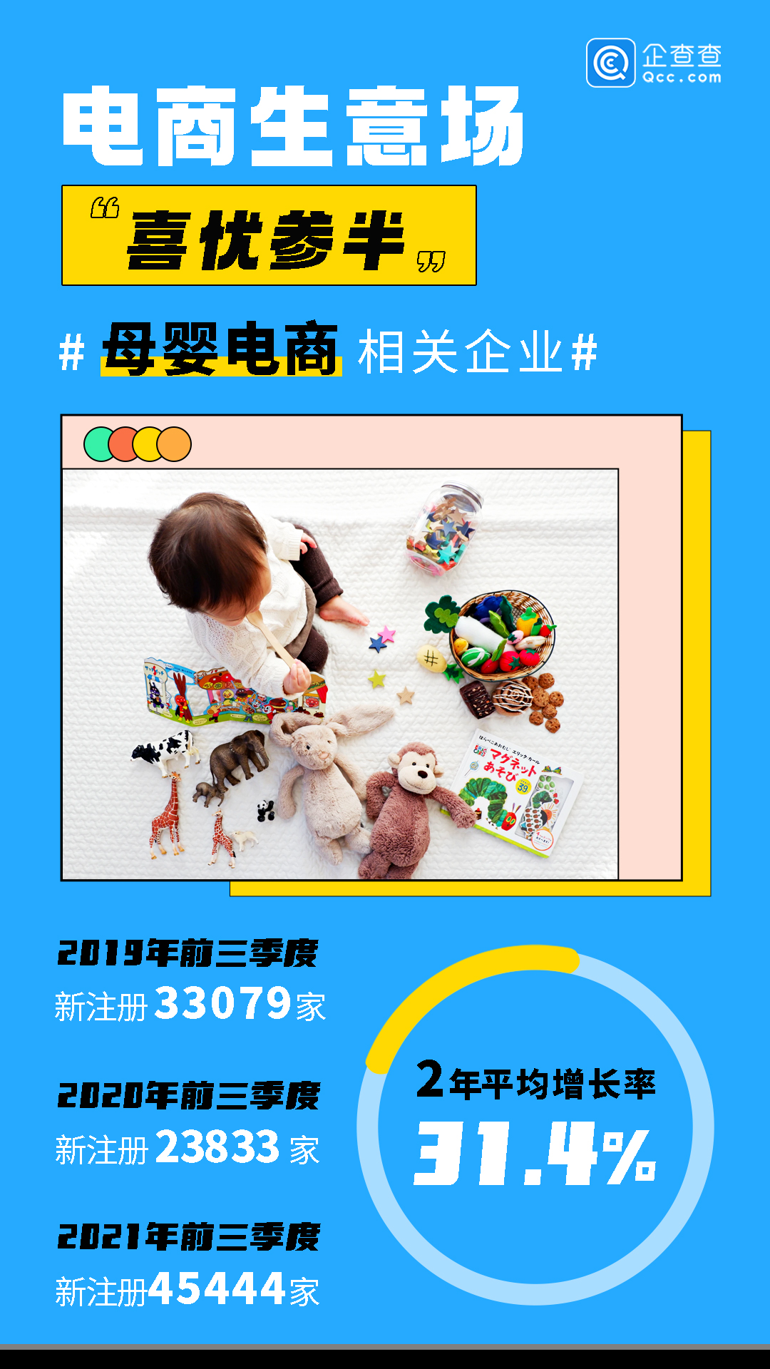 企查查数据显示,我国目前共有现存的“母婴电商”相关企业22.7万家,今年前三季度,电商相关企业的注册量为4.5万家,去年同期的企业注册量较前年有所下降,今年增速可观,近两年平均增长率达31.4%。