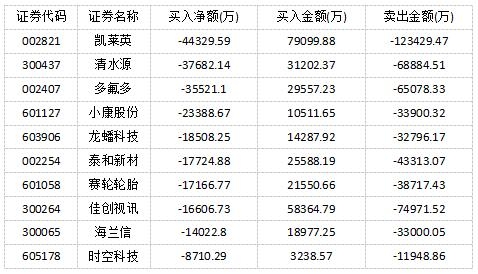从表二主力卖出净额前列的个股来看,本周主力总体抛压力度也不大,只有9只个股卖出净额超过亿元,分别是凯莱英、清水源、多氟多、小康股份、龙蟠科技、泰和新材、赛轮轮胎、佳创视讯、海兰信。