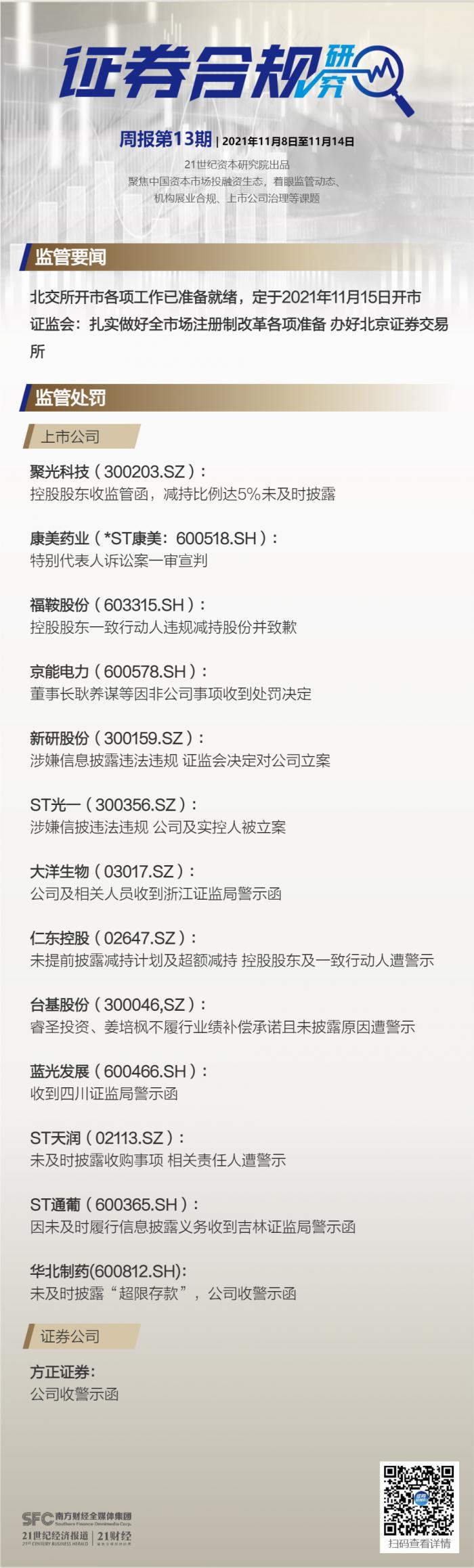11月12日,仁东控股公告,公司控股股东仁东信息及其一致行动人仁东天津于2021年11月12日收到浙江证监局《行政监管措施决定书》。2020年12月17日、12月18日,仁东信息、仁东天津通过集中竞价分别被券商平仓处置仁东控股股份559万股、406.36万股,且未提前15个交易日预披露减持计划。2020年12月30日至2021年3月29日期间,仁东信息及仁东天津通过大宗交易方式累计减持公司股份总数的4.81%,超比例减持2.81%。2021年3月19日至6月8日期间,仁东信息及仁东天津通过集中竞价累计减持公司股份总数的6.99%,超比例减持5.99%。