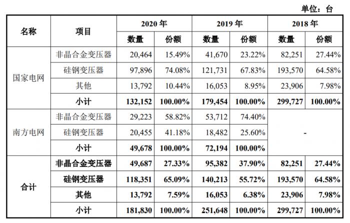 最近三年,国家电网非晶合金变压器招标量占比分别为27.44%、23.22%和15.49%;2019年、2020年,南方电网非晶合金变压器招标量占比分别为74.40%、58.82%,国内非晶合金变压器招标量占比均呈现下降趋势。