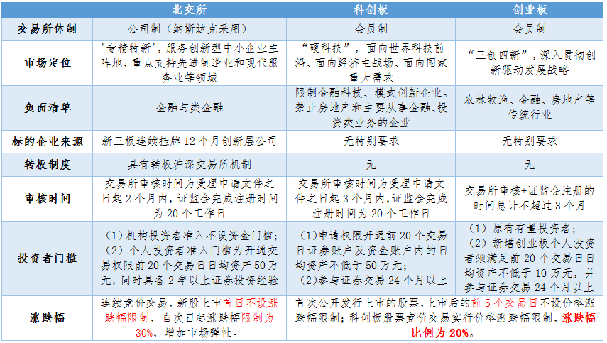 目前,北交所、科创板、创业板在不同层次的制度建设和市场定位上存在差异化“错位竞争”的局面。事实上,北交所从制度上基本平移了精选层制度,局部的调整主要源于“交易所”地位的需求。对于三大市场,北交所具有财务指标要求更低、上市审核时间短、交易制度更为宽松、拥有转板机制、投资者门槛放低与科创板齐平等一系列配套机制创新优势。