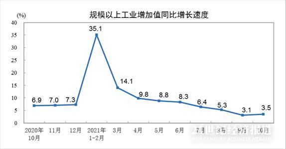 国家统计局11月15日公布的数据显示,10月份,规模以上工业增加值同比实际增长3.5%,增速较上月提升0.39个百分点;比2019年同期增长10.6%,两年平均增长5.2%,较上月增长0.2个百分点。