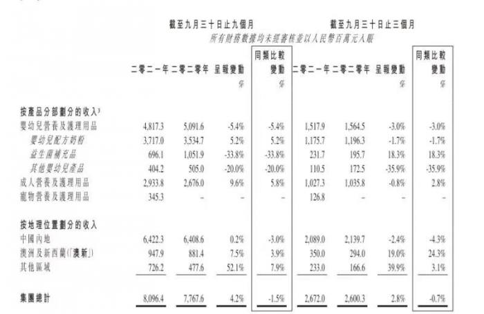 截至第三季度,婴幼儿营养及护理用品业务单元(BNC)实现营收48.17亿元,同比下降5.4%。该业务单元业务呈现疲软,主要由于中国内地出生率降低带来的需求减少,以及市场竞争加剧。