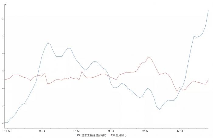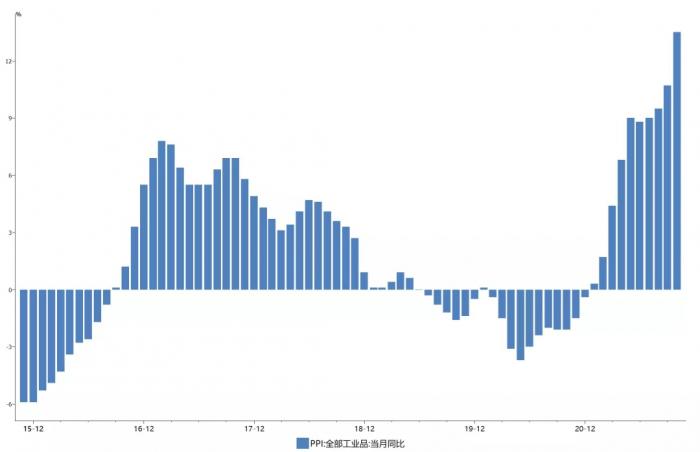 今年以来,受到国际输入性因素的影响,全球供应链持续紧张,国内能源供应也偏紧。10月PPI同比上涨13.5%,创出1997年有该项数据以来的历史新高,在上月“破10”的基础上继续上行2.8个百分点。