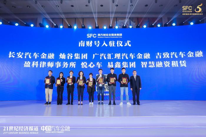 集体入驻仪式现场,南方财经全媒体集团副总编辑、21世纪报系总编辑邓红辉为这批南财号新成员颁发了入驻纪念牌匾,它们是(以汉语拼音排序):长安汽车金融、灿谷集团、广汽汇理汽车金融、吉致汽车金融、盈科律师事务所、悦心车、易鑫集团、智慧融资租赁。