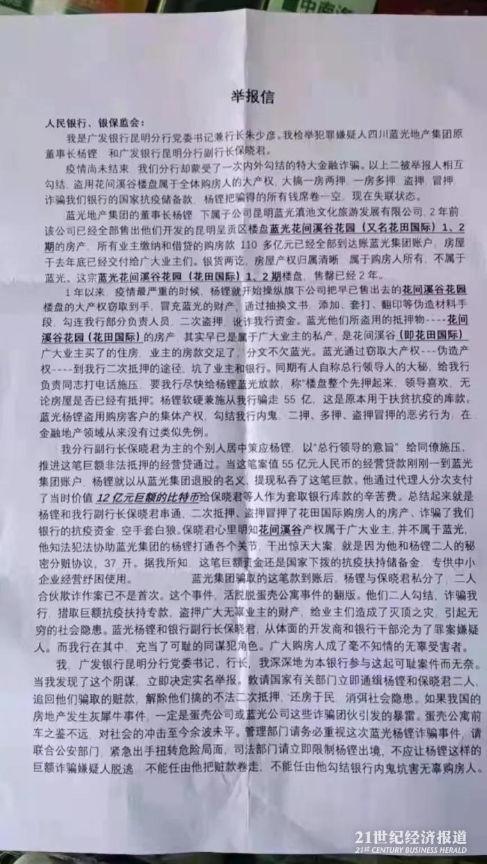11月17日,网络上流传一份广发银行昆明分行党委书记兼行长朱少彦检举蓝光集团原董事长杨铿和广发银行昆明分行副行长保晓君的举报信。举报信中表示,两人勾结通过一房多抵,二次盗押等方式向广发银行骗取贷款55亿元。