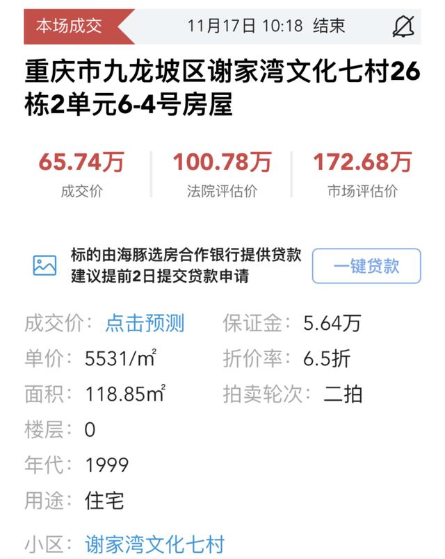 从今日成交的房源来看,有一套位于谢家湾的老房子,以65.74万元成交了。以法院评估价为参考,折价率达到了6.5折。