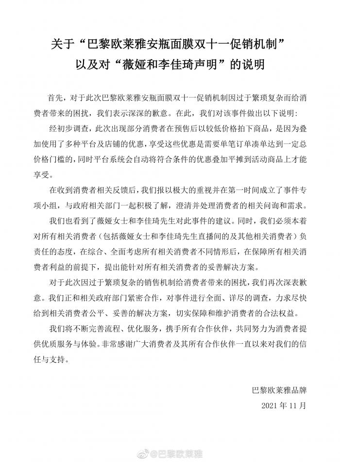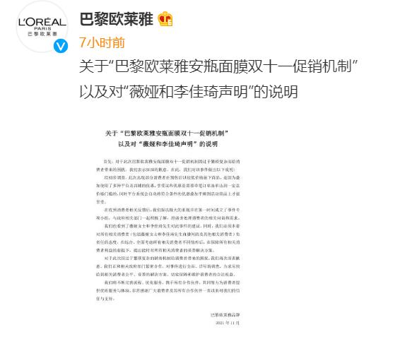 11月18日凌晨,巴黎欧莱雅在官方微博发布声明,对此前预售差价一事致歉并表示已成立事件专项小组,将在综合、全面考虑所有相关消费者不同清醒后,在报站给所有相关消费者利益的前提下,提出能针对多有相关消费者的妥善解决方案。