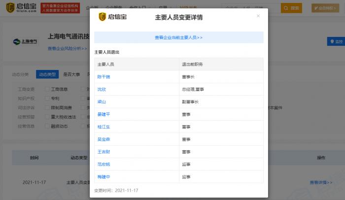 启信宝最新的数据显示,11月17日,上电通讯诸多高管离任,如董事长陈干锦、总经理沈欣、副董事长梁山、董事晏建平、桂江生、吴宝森和王吉财,以及监事范宏铭、梅建中。