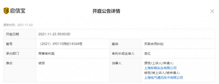 2021年11月25日,上海标萌与上电通讯的庭审将开始。