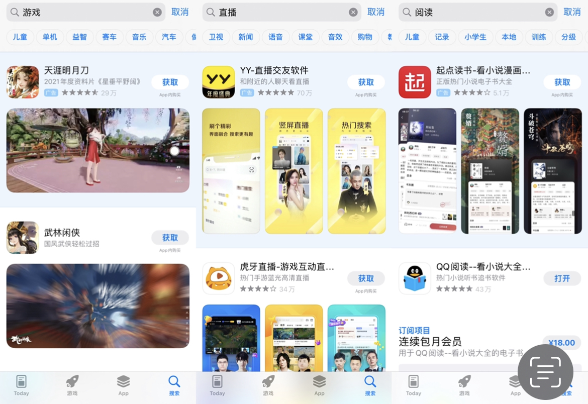 据郭静的互联网圈观察,日前,苹果官方应用商店App Store在搜索功能中新增了“标签”分类,当用户搜索“游戏”、“阅读”、“直播”等关键词时,搜索框的下方都会出现更细分的关键词