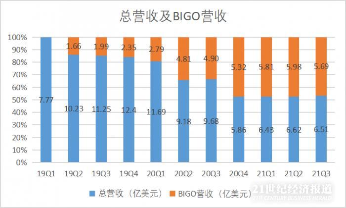 从产品上看,在剥离虎牙与YY直播后,BIGO板块逐渐成为欢聚集团营收倚靠。由图可知,2020年第二季度开始,BIGO收入已占集团总营收比重超一半,2020年第四季度超90%。今年三季度,BIGO营收约5.69亿美元,占欢聚总营收比重超87%。可以说,如今BIGO板块的营收增减会显著影响欢聚集团的业绩变化。