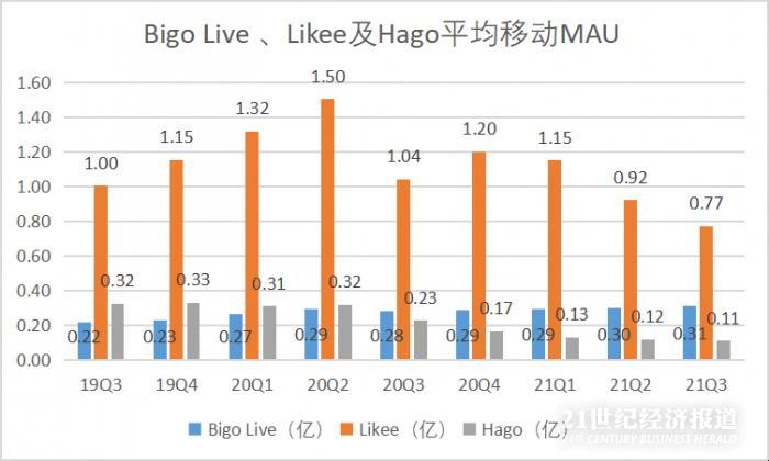 主要产品中,Likee平均移动由2020年同期的1.04亿降至0.77亿,降幅为26.2%;Hago的平均移动MAU从2020年同期的0.23亿降至0.11亿,降幅为 52.4%;Bigo Live的平均移动MAU从2020年同期的0.28亿增加到0.31亿,这主要原因是印度境外的MAU增加。具体产品的平均移动MAU与全球平均移动MAU增减变化基本相同。