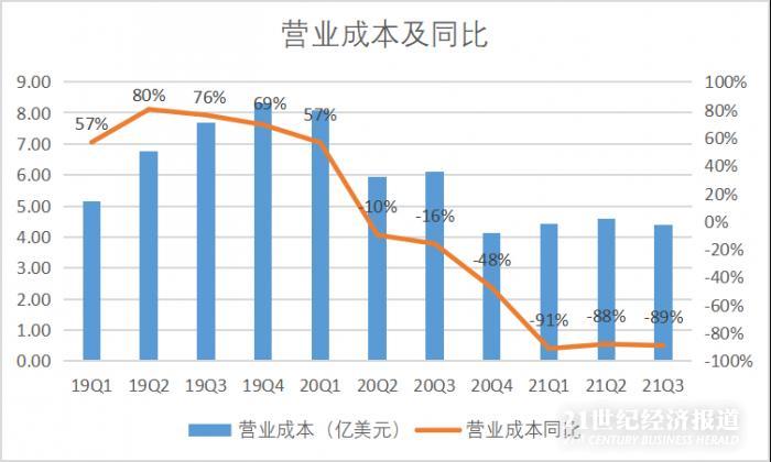 今年第三季度,欢聚集团营业成本为4.4亿美元,同比下降88.9%。其中,收入分成费用和内容成本从2020年同期的2.34亿美元增加至2.9亿美元;带宽成本从2020年同期的2760万美元下降至1900万美元,根据财报,这主要由于带宽使用效率提升。