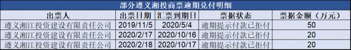 记者获得的多张电子商业承兑汇票显示,出票人和承兑人均为遵义湘江投资建设有限责任公司,商票汇票出票日期在2019年末2020年初,相关商票均在2020年到期,票据状态为“逾期提示付款已拒付”。