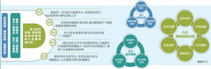 《规划》提出,到2025年底,建成统一安全的大数据中心,各级政府部门非涉密系统100%迁移上云。实现政务数据共享交换,激活数据资产,构建数据资源服务体系。变“线下跑”为“网上办”、变“分头办”为“协同办”,非涉密政务服务事项实现全流程“一网通办”。建立协同工作平台和管理机制,大幅提升大数据预测预警能力、政府科学决策能力、跨部门行政事务协同效率。建成综合治理平台,推进“互联网+”与教育、健康医疗等领域深度融合,实现全省社会治理精准化、公共服务均等化和普惠化。