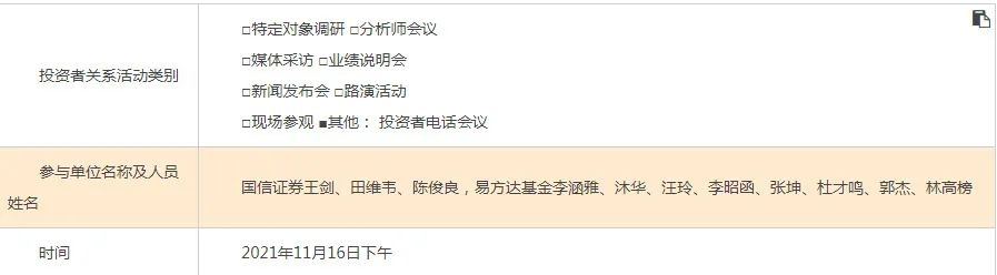 公私募基金行业的其他不少明星基金经理也没闲着。11月10日,“千亿顶流”易方达基金张坤参与了宁波银行的电话会议,与其一同参与此次调研的还有世诚投资创始人陈家琳、富国基金百亿级基金经理杨栋等。