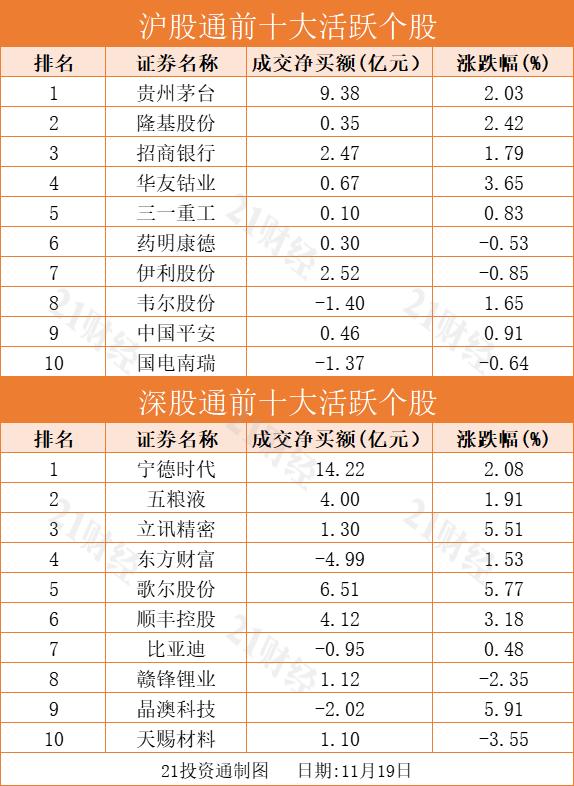 今日十大活跃个股方面,宁德时代、贵州茅台、歌尔股份分别获净买入14.22亿元、9.38亿元、6.51亿元。东方财富净卖出额居首,金额为4.99亿元。