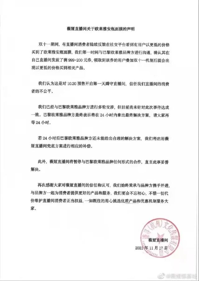 11月17日,主播薇娅、李佳琦可能也坐不住了,接连发表声明,直接点名给巴黎欧莱雅在24小时解决问题,在事情妥善处理之前,将暂停与巴黎欧莱雅官方旗舰店的一切合作。