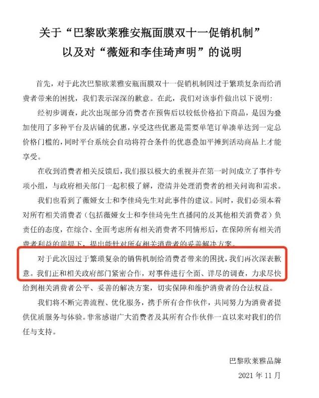 11月8日凌晨,巴黎欧莱雅终于公开回应,表示对于此次巴黎欧莱雅安瓶面膜双十一促销机制因过于繁琐复杂而给消费者带来的困扰,向消费者道歉,并表示正在和政府部门紧密合作,力求尽快解决问题。但没有回应李佳琦、薇娅的诉求。