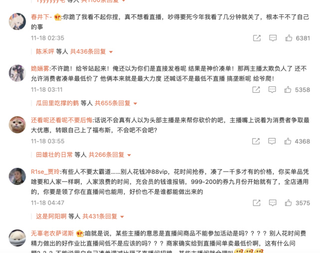 11月18日,对比前两天舆论一边倒批评品牌方,在欧莱雅公开回应之后,网上也出现了很多其他的声音,开始有很多网友站在欧莱雅这一方。“不许跪!给爷站起来!”、“欧莱雅你以后如果因为薇娅和李佳琦,不让普通消费者叠加优惠券,我瞧不起你,单品最低确实是李佳琦薇娅。”