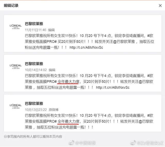 a、欧莱雅官方微博,的确在10月13日和10月14日发文称,“10月20日李佳琦直播间欧莱雅安瓶面膜是全年最大力度”。而11月11日,上述微博已经将“全年最大力度”几个字去掉了。