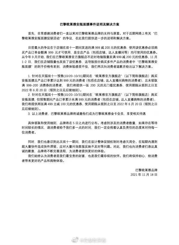 11月18日晚,欧莱雅官方再次发出面膜事件说明及解决方案,就争议最大的大额满减券问题,向有“差价”的消费者提供大额券和金卡会员,并向消费者再次道歉。
