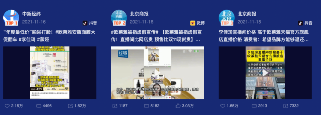 11月15日-16日,陆续开始有媒体关注报道称,#欧莱雅安瓶面膜大促翻车#、#欧莱雅被指虚假宣传#,消费者希望品牌方能够退还差价。