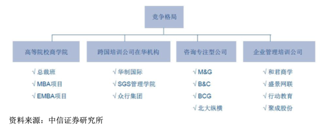 从传统格局来看,企业培养主要有四大玩家:高等院校商学院、跨国培训公司在华机构、咨询专注型公司、企业管理培养公司。