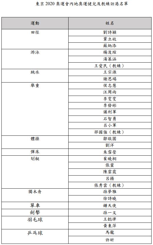 (即将访港的奥运健儿代表团名单。来源于香港政府新闻网)
